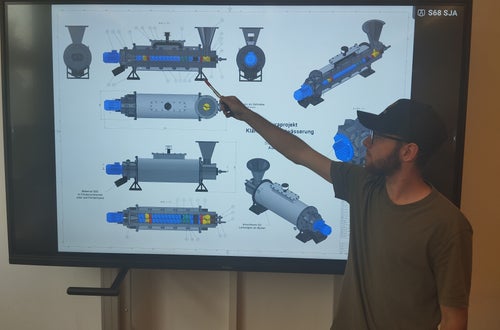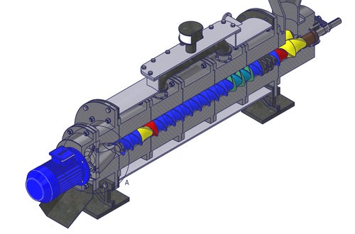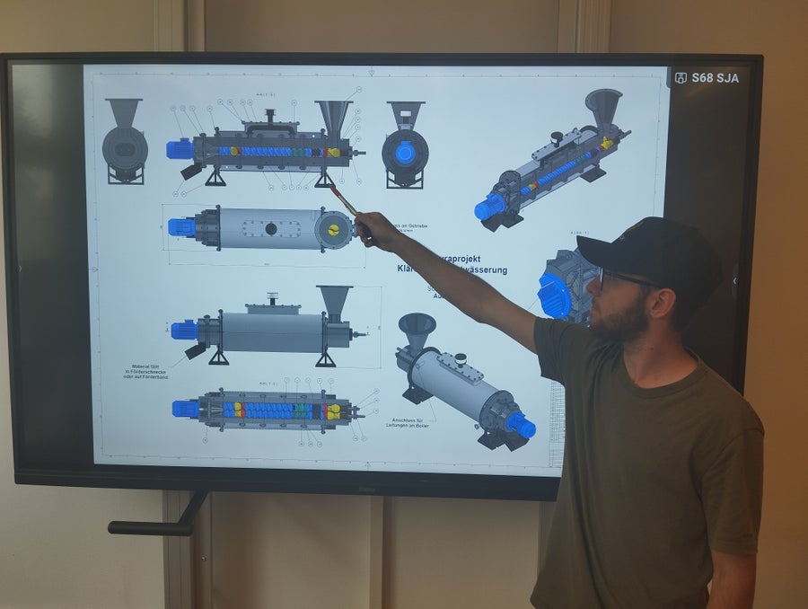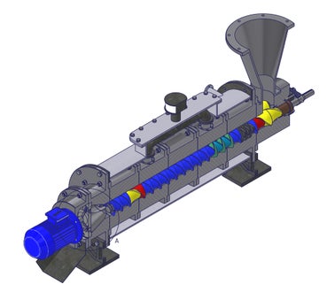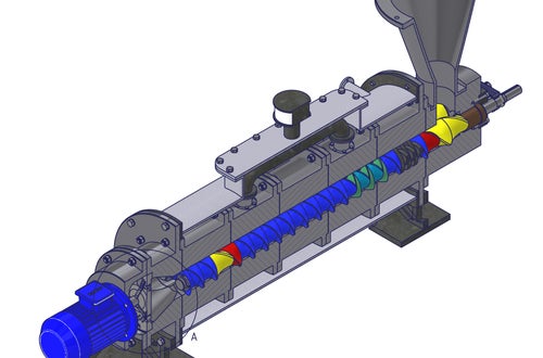 Ein Extruder, der zur Klärschlammentwässerung dient, wurde von Manuel Auer konzipiert. Funktionsweise: Durch zwei Keilwellen mit montierten Segmenten wird der Schlamm verdichtet. Unterschiedliche Steigungen und Geometrien der verschiedenfarbigen, spiegelbildlich angeordneten Segmente ermöglichen eine effektive Komprimierung. Ein 220-kW-Motor liefert die nötige Kraft. Die durch die Reibung erzeugte Wärme bewirkt, dass über ein Mantelrohr Warmwasser zurückgewonnen wird. Letztendlich wird der Schlamm durch eine Lochscheibe gepresst, als Pellets geformt, von rotierenden Messern abgeschnitten und über ein Förderband in Container oder Big Bags transportiert.